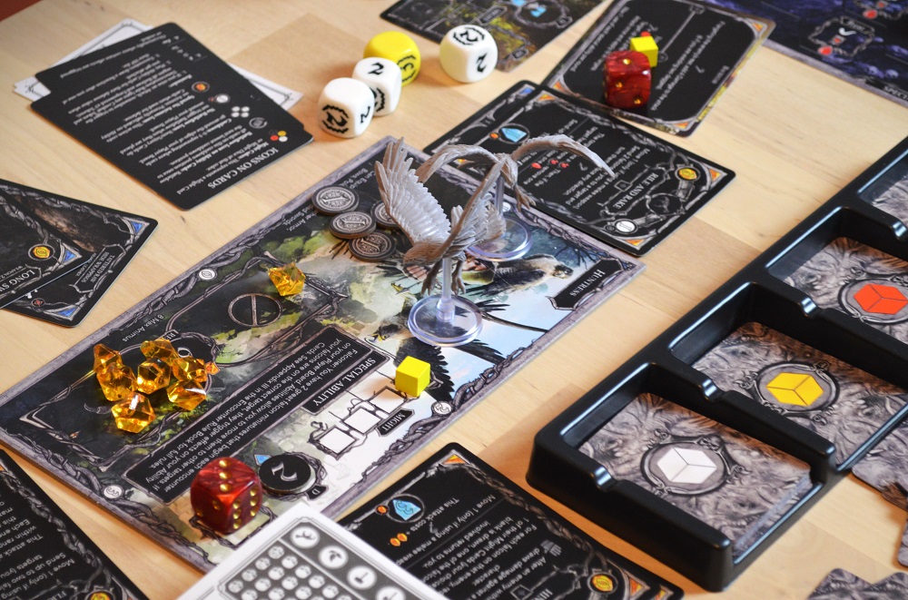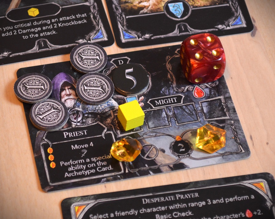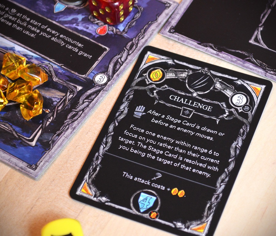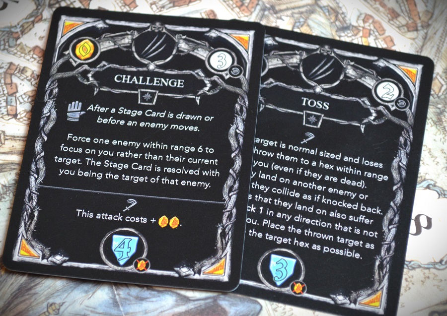 Если вкратце, то в свой ход у героя есть движение + розыгрыш карты действия. На всё необходимо тратить кристаллы (похожая механика была в Конане). При перемещении каждая клетка = кристалл. Стоимость же действия указана на выбранной карте в верхнем левом углу. А вот справа расположился номер слота рядом с планшетом, куда карта отправляется после розыгрыша. Если в этом слоте находятся другие карточки, то они циркулируют в следующий (ближе к нулю). В начале раунда игрок восстанавливает у персонажа некоторое число кристаллов и забирает обратно в руку все карты с нулевого слота.
