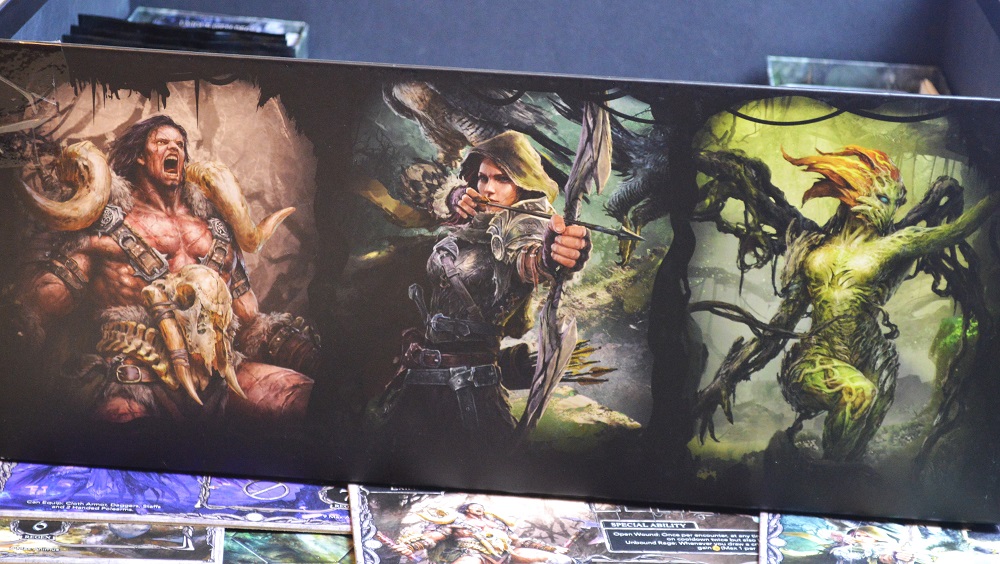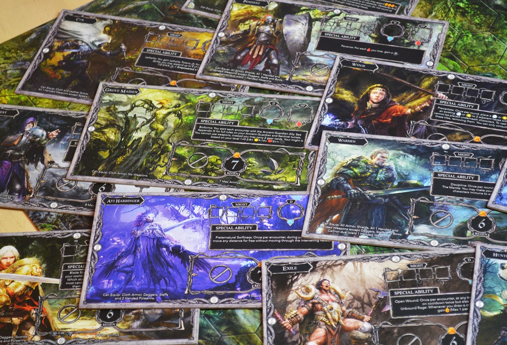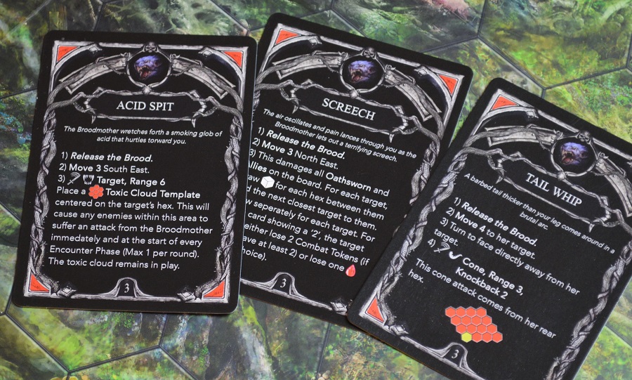Сражение – это не только менеджмент кристаллов и своевременная прокрутка карт действий, но и постепенное прощупывание врага. У каждого монстра помимо планшетов со свойствами и зонами тела имеется ещё и уникальная колода, согласно которой он активируется каждый раунд. И понятное дело, что это не просто “пройти 2 клетки и ударить”, там иногда целые сочинения. Опять же, с одной стороны это позволяет обрисовать манеру поведения того или иного босса, сделать бои более атмосферными и разнообразными, но с другой – влечёт за собой кучу вопросов и непоняток с интерпретацией той или иной карты. С героями похожая ситуация. Я это к тому, что освоить с наскока игру не получится, и у вас будет возникать много вопросов. А это сбивает темп и мешает получать удовольствие от процесса.