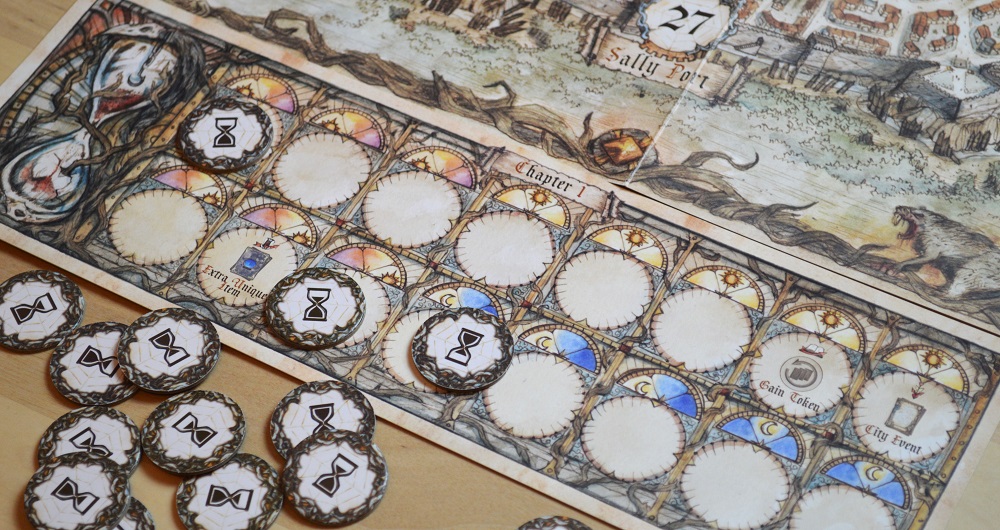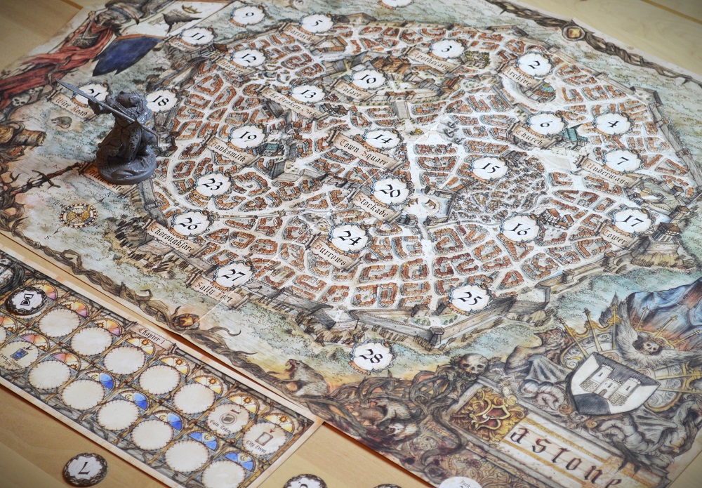 Сценарий чётко поделён на 2 части: фаза истории и фаза сражения. Для первой нужны лишь планшеты героев, карты событий, горстка жетонов и схематичная карта города, усыпанная различными локациями.