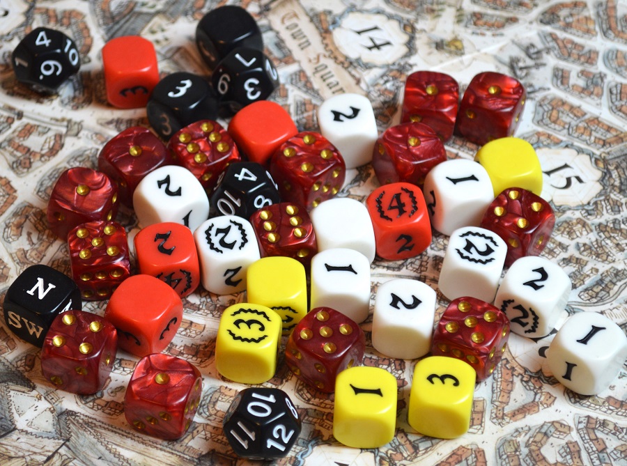 Стоит уточнить, что все проверки и атаки тут можно отыгрывать двумя способами: с помощью кубиков или специальных колод, имитирующих эти самые кубики. Понятное дело, что второй вариант более предсказуемый. Мы, например, для монстров используем карточки, а для собственных атак/проверок кубы. Механика в обоих случаях идентична – с элементом push your luck. Просто с кубиками удачи будет ещё больше.