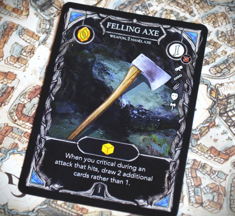 Если для успешной проверки необходимо определённое число успехов, то для успешной атаки – преодолеть защиту врага. Поможет в этом амуниция, повышающая показатель силы персонажа (might). Допустим, жёлтый кубик на топоре означает, что, атакуя, герой помимо самых слабых белых кубиков (или карт) может бросить один жёлтый. А ещё практически у каждого оружия имеется дополнительное свойство, и чтобы его применить, карту тоже придётся выложить в слот циркуляции. Правда, амуниция не вызывает перемещение других карт, о чём напоминает маленькая иконка.
