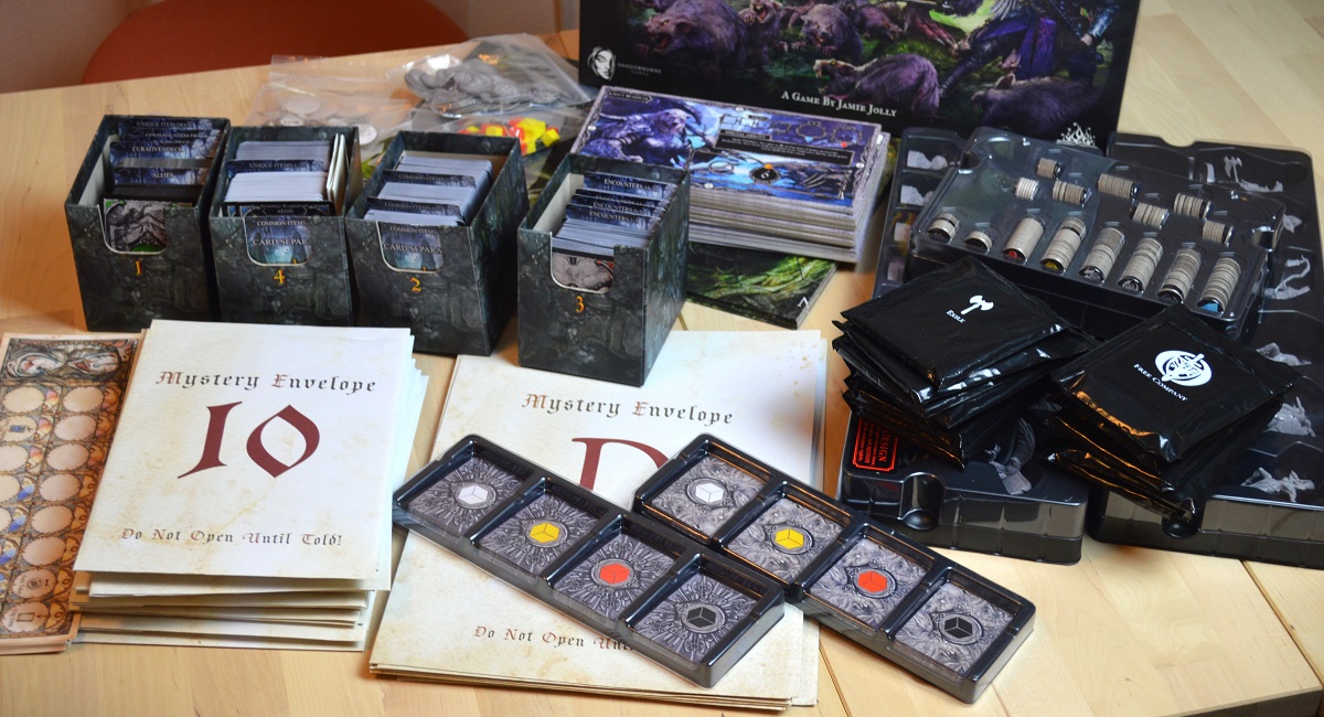 Кроме того, авторы не заставляли выкладывать круглую сумму за миниатюры, а сразу предложили альтернативную версию с картонками на подставках. Например, второе издание с подставками обошлось бы в 125$, а с миниатюрами – 225$. Я не фанат серого пластика, красить мне лень, поэтому версия для бедных меня более чем устраивала. Вон, весь Глум прошли без каких-либо проблем. А тут для минек ещё и второй гроб прилагался, так как враги тут держатся в секрете в специальных коробочках (для бедных – в конвертах).