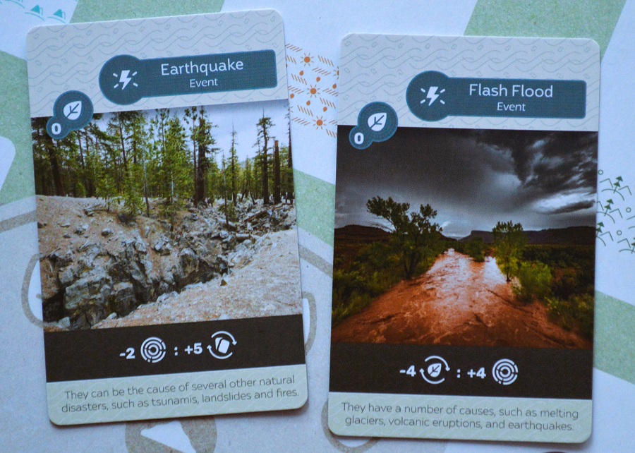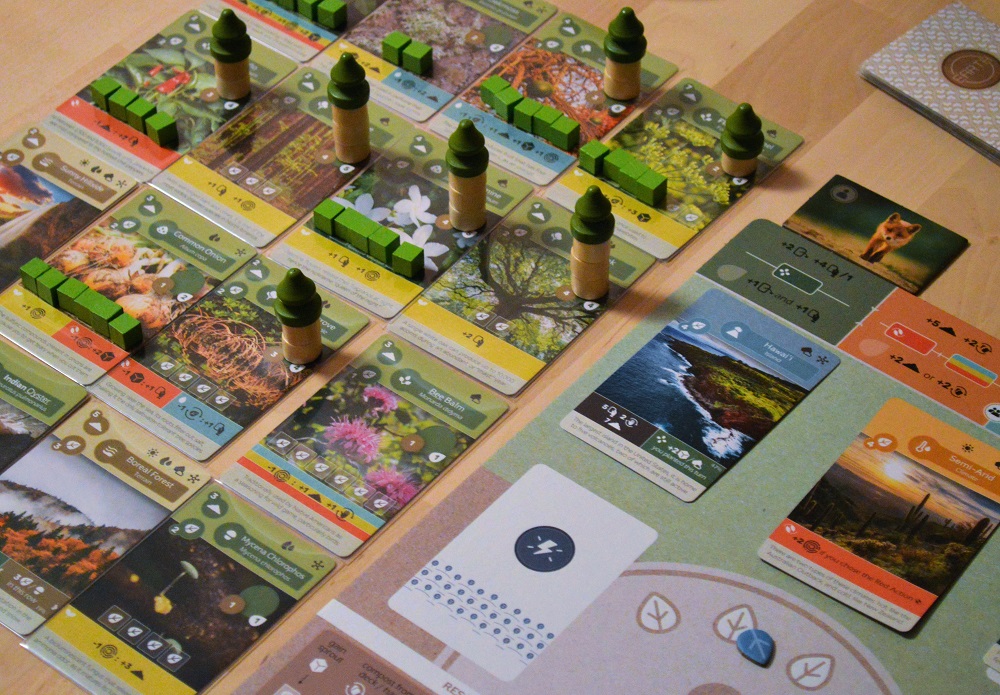 Флора и местность выкладываются в сетку 4 на 4, и заполнение личной зоны является триггером окончания партии. Вообще, в этом аспекте Земля напоминает ещё одну игру об озеленении – Verdant. Тоже пространственные цели, механика роста. Да и, честно говоря, Земля ощущается ровно таким же сухим пасьянсом, в который лучше всего играть вдвоём. В дуэли можно хоть немного быть в курсе дел соперника, плюс чуточку раскрывается тот самый follow, ведь ты захочешь выбирать такие действия, чтобы твой движок приносил плоды, а оппонента – простаивал.