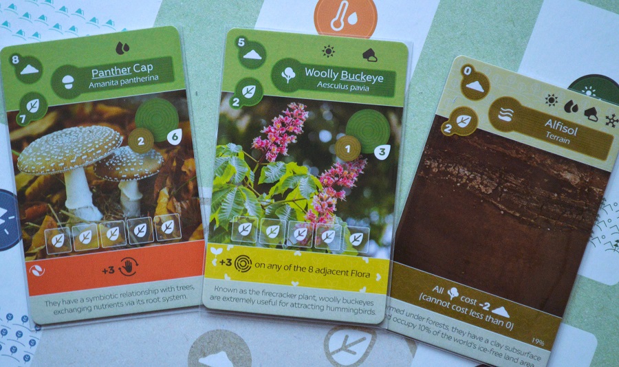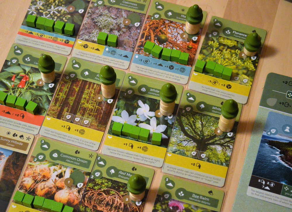 Можно выложить карты флоры или местности, взять почву (местная валюта), добавить на карты кубики ростков или же вырастить стебли-башенки. Всё это так или иначе принесёт победные очки и позволит достичь целей, коих на партию выбирается довольно много. Изначально даже трудно всё это держать в голове, ибо задачи тут далеки от логики и до жути абстрактны. Вдобавок, карточки прям перегружены информацией и символами.