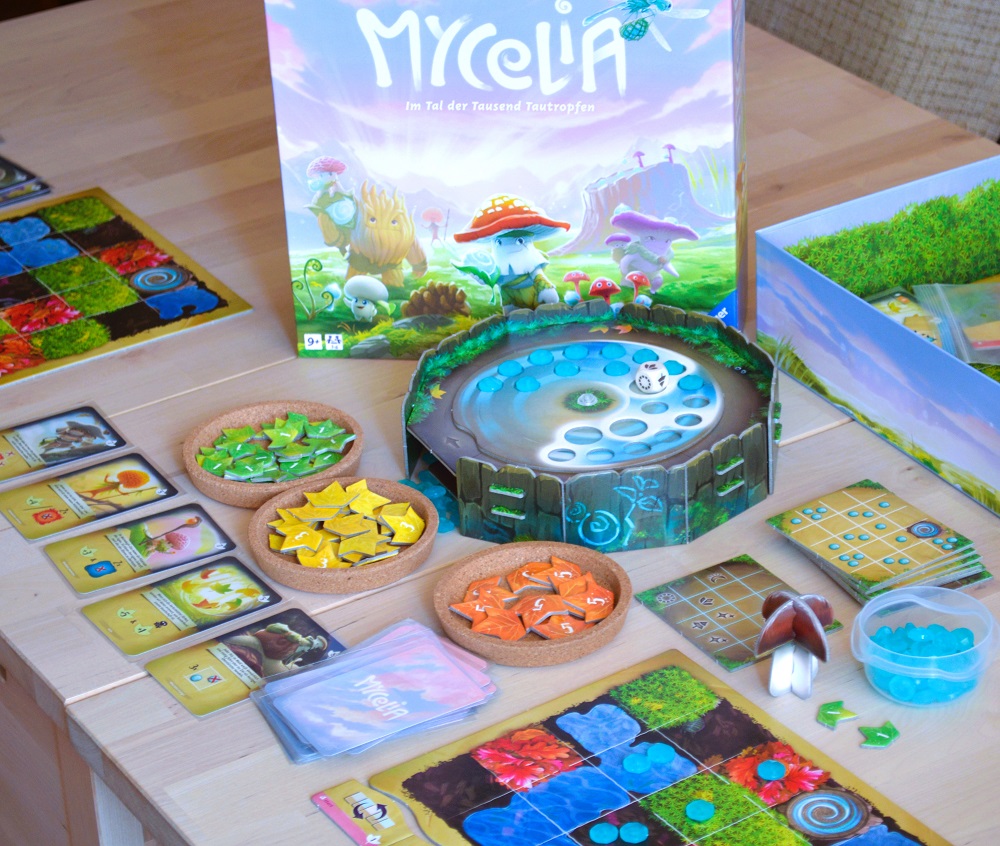 Mycelia. Семейный декбилдинг, где с помощью свойств карточек необходимо уничтожать или двигать в порталы капли росы. Кто первый избавится от всех фишек, тот и молодец. В комплекте идёт хитрая приблуда, которая при заполнении фишками капель несколько раз за партию прокручивается, дабы произвести самоочистку и выплюнуть кубик – он укажет, куда нужно положить дополнительные капли.