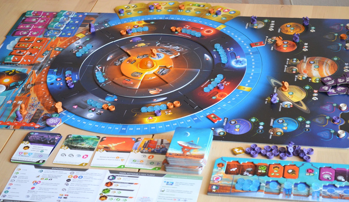 SETI привлекла меня сразу же после анонса: интересная тема исследования космоса в поисках внеземных цивилизаций; крутящееся поле, олицетворяющее собой солнечную систему; множество уникальных карт, которые можно разыгрывать разными способами. Плюс, издатель Czech Games Edition, относящийся к своим проектам с особым трепетом.