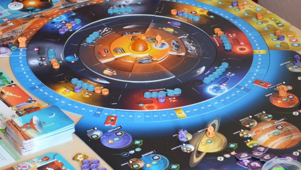 И она годная, только сразу нужно сказать, что существенных оригинальностей тут немного, вернее, оригинальность тут, по сути, одна – крутящиеся кольца солнечной системы. Остальное уж больно напоминает прочие игры с толстенными колодами карт, к примеру, Покорение Марса.