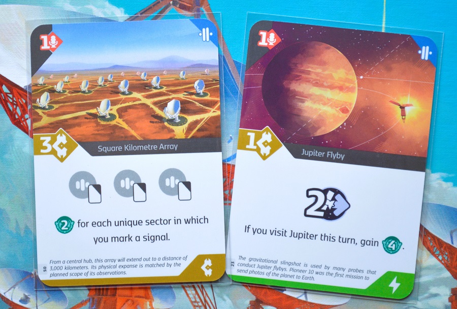 Есть задания попроще, их нужно выполнить в текущий ход (например, завершить движение на такой-то планете); или более серьёзные, на которые потребуется несколько раундов (иметь по следу каждого типа или две орбитальные станции). Кроме того, имеются эффекты, которые триггерятся за определённые действия/достижения, и, разумеется, цели на конец партии.