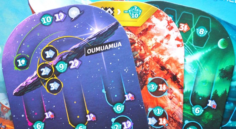 Что касается фишки с 5 разными внеземными цивилизациями, то, это несомненно плюс к вариативности. Кстати, если хотите немножечко усилить элемент исследования, то заранее не читайте их листы. Уточню, что на партию случайным образом выбирается две расы, которые открываются только после того, как игроки отметят по следу каждого цвета. За это обычно полагаются не только очки, но и уникальные карточки с более интересными и мощными эффектами. У каждой расы своя специфика при заполнении следов на планшете, тематические миссии на картах, а иногда даже имеются вспомогательные компоненты. Например, при обнаружении на поле добавляется огромный астероид, который тоже можно посетить.