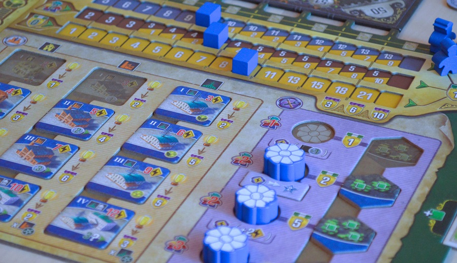 Ещё перезагрузка позволяет скопленные жетончики звёзд-достижений (даются, в основном, за подпитку зданий) сконвертировать в множители для общих целей на специальном поле. Тоже интересная идея, так как в каждой цветной зоне у игрока может быть только один маркер (если уже есть, и ниже поставить нельзя, то получаешь компенсацию в монетах и рабочих, но в конце штрафные очки), а для каждой цели можно получить аж по два множителя.