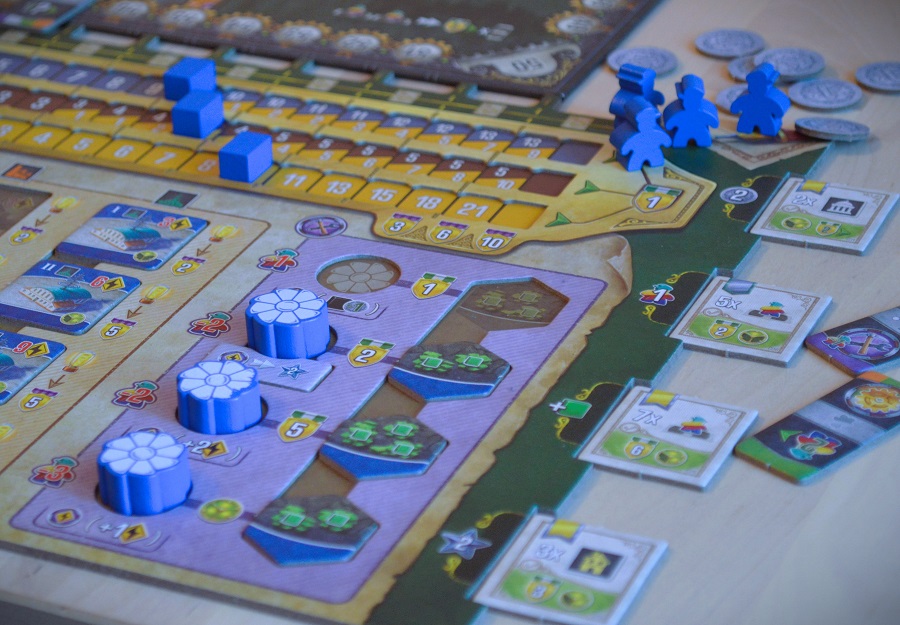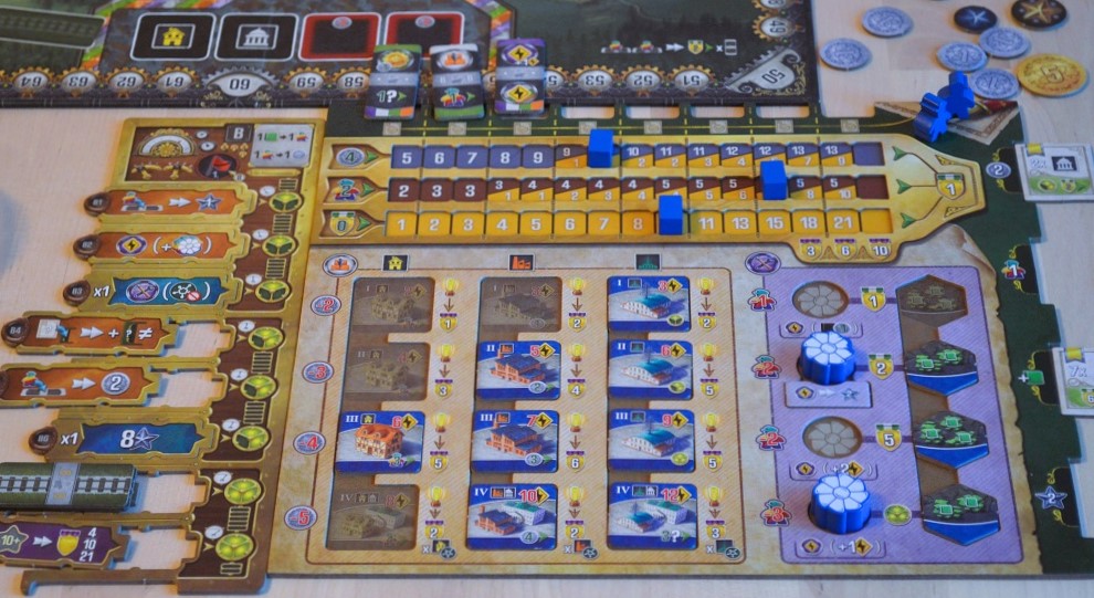 Первая отличительная черта – занятная ключевая механика, когда в свой ход пристраиваешь к верхней части планшета один из прямоугольных жетонов и выполняешь указанные на нём два действия. Основных действий 5 штук. Развитие позволяет купить на рынке новые жетоны с более вкусными эффектами, скидками и т.д. Контракт, само собой, даёт возможность взять один из открытых контрактов-заданий, выполняя которые можно не только пополнить очковый багаж, но и изучить полезные технологии. С помощью урбанизации строятся здания с планшета. Индустриализация позволяет выкладывать шахты и тем самым добывать уран, а также возводить турбины вблизи электростанций. И, наконец, с помощью снабжения энергией здания переворачиваются на сторону с победными очками и прочими плюшками, чаще всего на увеличение дохода.
