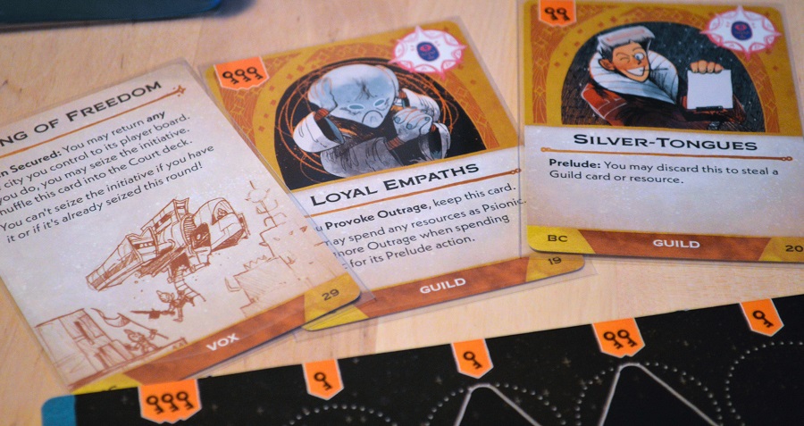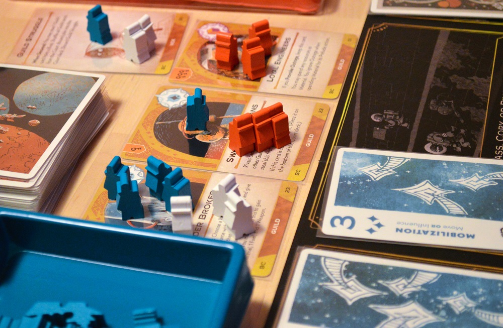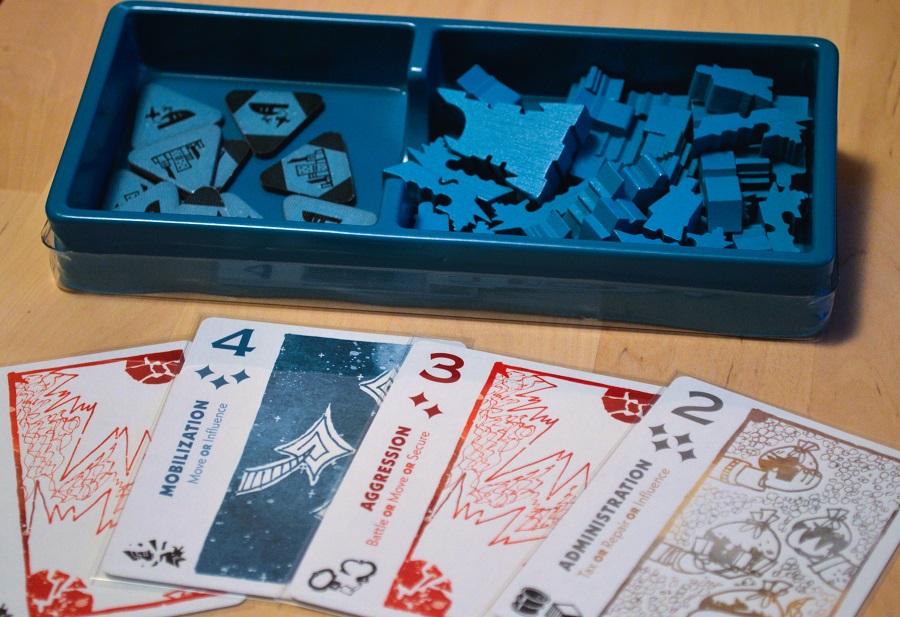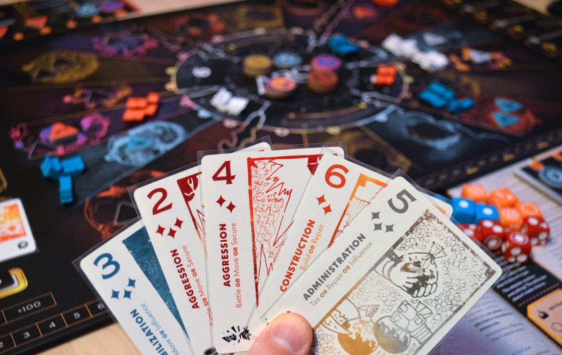 Если вкратце, то в начале каждого из 5 раундов всем раздаётся по 6 карт четырёх разных мастей номиналом от 1 до 7 (или от 2 до 6, если участников меньше четырёх). Каждой масти соответствуют определённые действия, например, красные карты отвечают за сражения, перемещение кораблей и получение карточек с полезными свойствами с рынка. Причём, чем больше номинал карты, тем меньше действий (ромбики под номиналом) дозволено совершить, и наоборот.