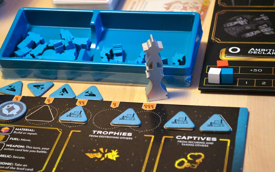 Всего за раунд можно объявить максимум три амбиции, и очки по ним распределяются в конце раунда – за первое и второе места. Несмотря на то, что целей 5, все они так или иначе связаны со сражениями (заложники, трофеи) и сбором определённых символов (ресурсы и карты рынка), которые, разумеется, можно воровать.