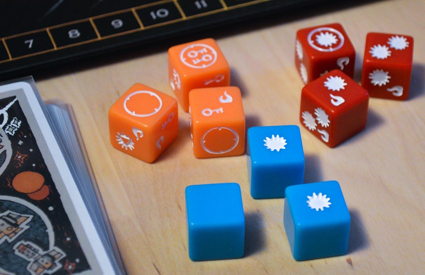 Ну, и пару слов о боёвке, она тоже порадовала. С одной стороны, тут всё просто: сколько кораблей, столько кубиков бросаешь. Но с другой – есть ряд интересных нюансов. Первый – атакующий сам выбирает, какие кубы применить в бою. Синие – для осторожных наступательных действий, на них много пустых граней и мало ранений. Красные – уже поинтереснее, там ранений побольше, но можно получить сдачи. И, наконец, жёлтые – они, в основном, предназначены для уничтожения построек и воровства ресурсов и карт. Боёвка примечательна ещё и тем, что агрессор решает судьбу сражения без участия защищающегося: выбрал кубы, бросил, распределил трофеи, если получилось – что-то там стырил.