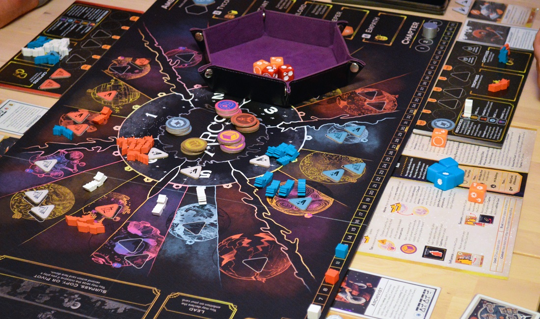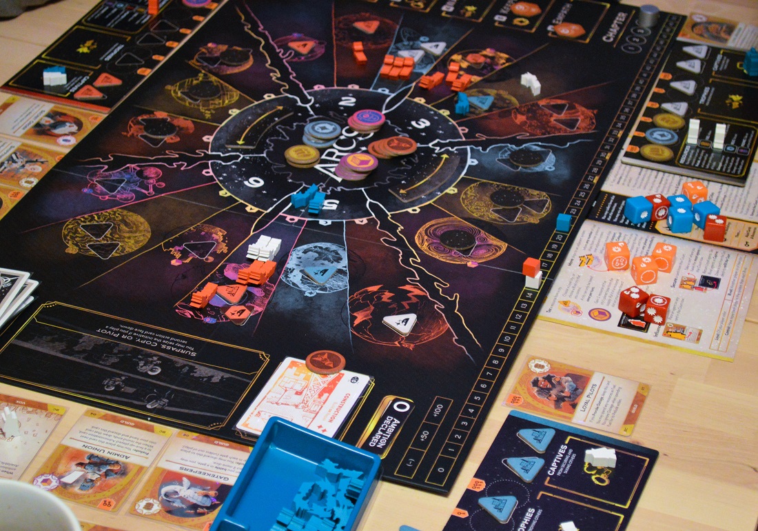 Первую партию с объяснением правил мы отыграли часа за три, а на вторую потратили чуть больше двух. Там уже добавили лидеров и доп-свойства, что сделало стороны уникальными. Благодаря костяку, основанному на взятках, и простым базовым действиям, события развивались достаточно динамично. Быстро менялась и ситуация на поле, посему назвать Arcs какой-то вдумчивой и размеренной стратегией язык не поворачивается. Всё тут нацелено на то, чтобы подрезать соперников, усыплять бдительность, выискивать хитрые лазейки, объединяться и душить лидера. Механика взяток, планировка поля, жетоны ресурсов с бонусными действиями, карты рынка с мощными свойствами – всё способствует агрессии с щепоткой хаоса.