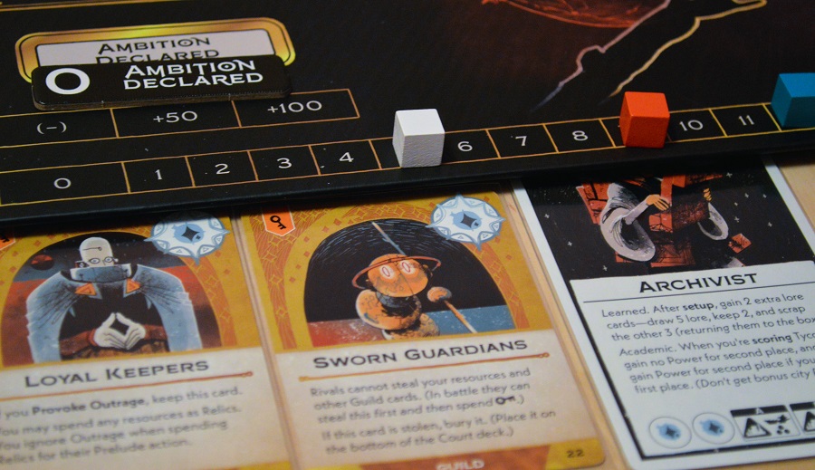 Инициатива – это не только право ходить первым и задавать тон на раунд, но ещё и возможность выбирать так называемые амбиции. Дело в том, что несмотря на жёсткие разборки, игра на победные очки. А единственный их источник – это уже упомянутые амбиции или попросту условия скоринга. Проще говоря, выкладывая карту, первый игрок может обнулить её номинал (специальной накладкой) и обозначить одну из 5 доступных амбиций жетоном с победными очками. Но и тут есть нюанс, амбицию можно выбирать согласно символу в правой нижней части сыгранной карты.