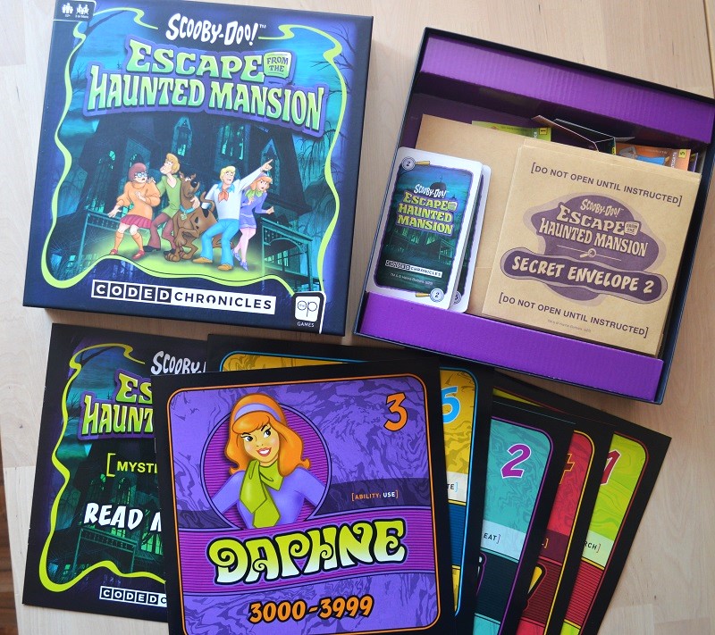 Scooby-Doo: Escape from the Haunted Mansion. Очередной настольный escape room а-ля Unlock или Exit, но с физическим полем. Ключевая механика довольно простая. Есть 5 знакомых персонажей, к каждому из которых привязана отдельная книжка с параграфами. Чтобы с чем-то повзаимодействовать в комнате, нужно добавить циферку на картонной фигурке героя к цифрам объекта (или скомбинированных объектов). По итогу должно получиться четырёхзначное число, его и нужно отыскать и зачитать в книге соответствующего персонажа. Так и происходит движение по сюжету и постепенное исследование поместья.