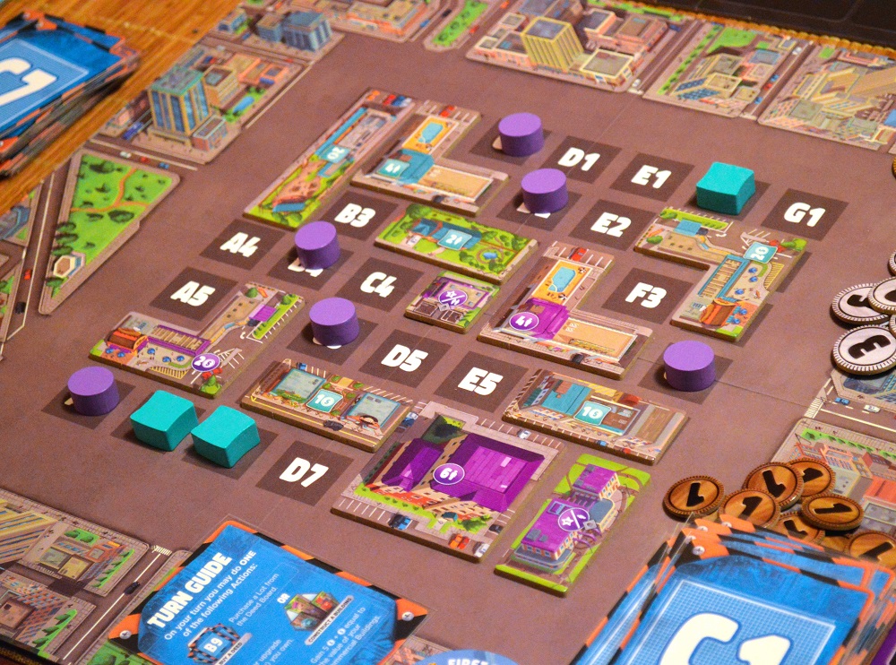 Очки тут начисляются по типам зданий: 1) за коммерческие (ПО напечатаны под ними на планшете); 2) за гражданские (дают ПО за определённые соседние здания, причём, за чужие тоже); 3) и за жилые постройки (они прокачивают трек населения, и лидер получает ПО согласно треку + бонус раунда, а все остальные – столько очков, сколько у игрока перед ними). В конце же партии полагается по 1 ПО за оставшиеся на поле маркеры брони, а коммерческие здания приносят ПО ещё и за доллары.