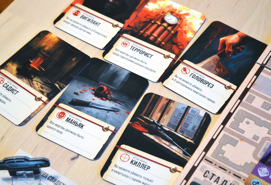 Всего в коробке 12 разных мотивов, но на игру выбирается лишь 6 штук. Например, “садист” не может убивать запуганных жителей, а “маньяк” выбирает жертв сугубо одного пола. Как видно, тёмной стороне нужно действовать таким образом, дабы жертвы как можно дольше подходили под максимальное число мотивов. Но, надо сказать, что следовать данному плану не так-то просто.