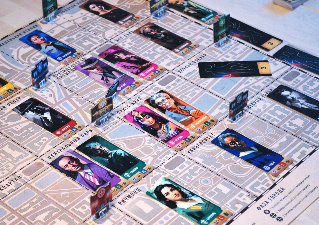 Сузить круг подозреваемых детектив может не только посредством допросов, но и с помощью зданий, которые позволяют выполнять уже знакомые действия (задать вопрос, успокоить жителя, взять тайл группы), но уже в соседних кварталах. Особняком стоит полицейский участок, с помощью него можно вести слежку: положить на жителя специальный жетон, а потом, сбросив его в любой момент, задать убийце вопрос – “может ли он убить этого жителя прямо сейчас?”. Это действие очень здорово помогает в вычислении мотива.