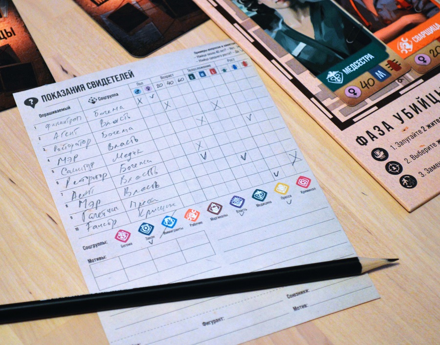 Длится сие действо 5, иногда 6 раундов. Задача детектива – выяснить, кто из жителей города преступник, и определить его мотив. Убийце, в свою очередь, необходимо оставить после себя 5 жертв, чётко следуя условию мотива.