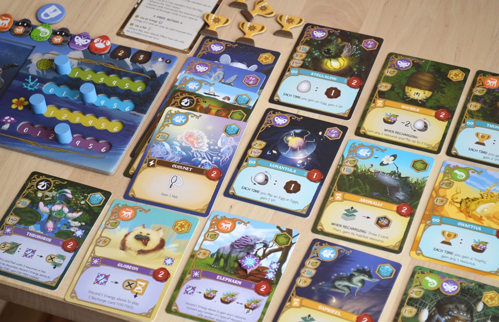 Так вот, в качестве второго основного действия можно разыграть до двух карт с руки. Колода состоит из 100+ уникальных существ с самыми разными свойствами, которые способствуют построению самых разных движков. Преимущественно свойства одноразовые, но есть ещё постоянные, на очки в конце партии, с активацией за жетончики энергии, а также на бонусы во время так называемой перезагрузки.