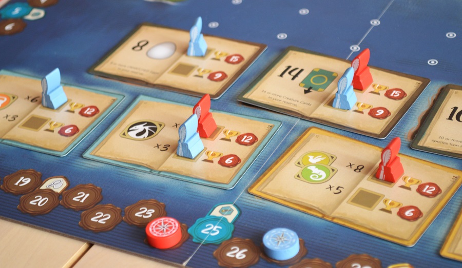 Последнее доступное действие – это выполнить цель: выставить с личного планшета маркер чернильницы на карточку достижения и тем самым помимо очков получить жетон трофея и бонус с планшета. Триггером же окончания партии является опустошение запаса трофеев. К очкам, заработанным по ходу дела (в основном, за яйца и свойства карт), добавляются очки за достижения, за жетоны трофеев (по 3 ПО) и за карточки.