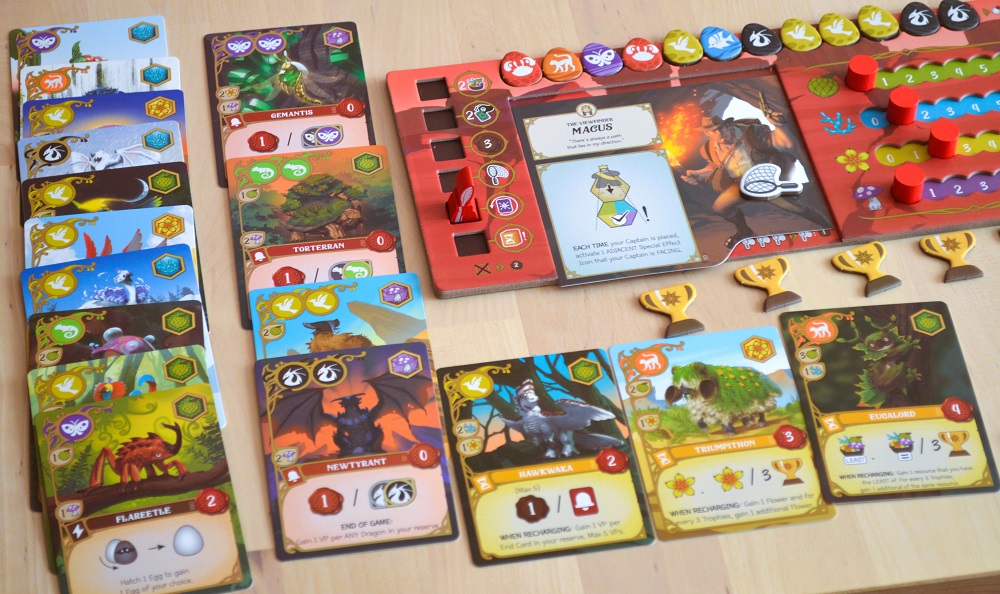 События же разворачиваются на уже упомянутом острове, усыпанным гексами с разными типами местности, бонусами и… яйцами. Под островом отведено специальное место для карточек достижений и жетончиков трофеев. И это неслучайно, ибо на достижениях и трофеях можно заработать чуть ли не половину победных очков.