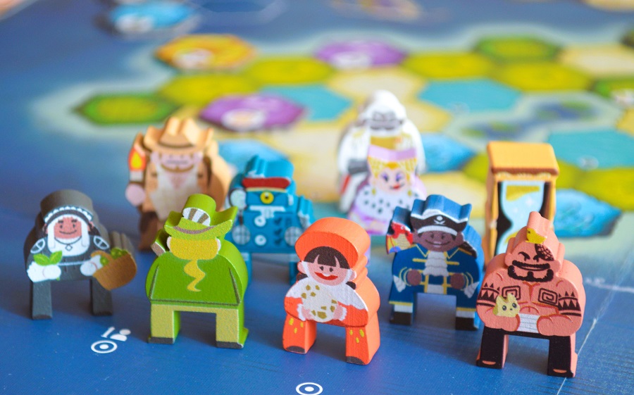 По наполнению игрушка действительно выглядит сочно: двухслойные планшеты, деревянные фигурки с цветной печатью с двух сторон, много уникальных и красочно оформленных карт. Более того, в делюксовом издании все жетоны выполнены из дерева, а кубки-трофеи так вообще металлические.