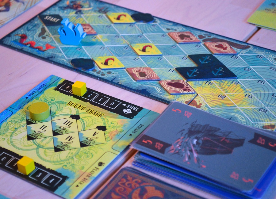 Во-вторых, как же здорово и, можно сказать, элегантно во взятки вплетены действия. С одной стороны – много информации о руке товарища (игроков всего двое, мастей всего 3, ещё и обмен карточкой в начале раунда), но с другой – сразу несколько дополнительный слоёв в виде действий за определённые сочетания символов, лимита на выигрыши и поля, где направление движения определяется по победителю взятки. А ведь на пути полно препятствий, которые нужно обходить (острова блокируют перемещение, а щупальце наносит ранение).