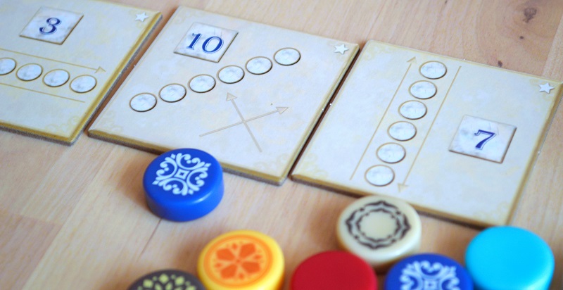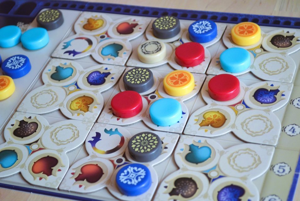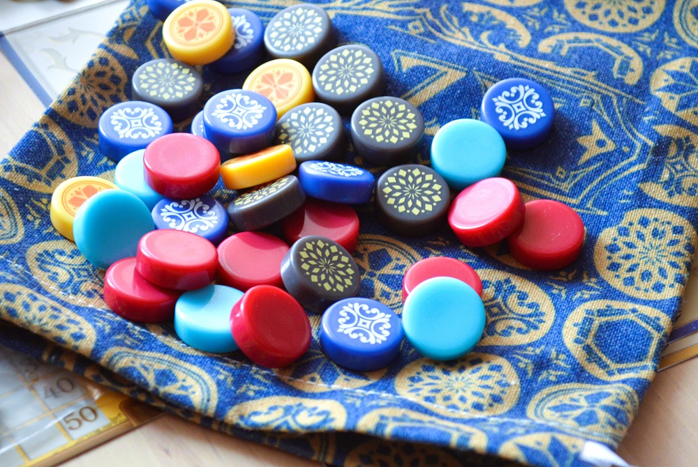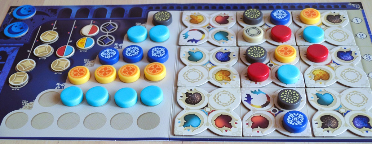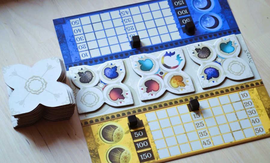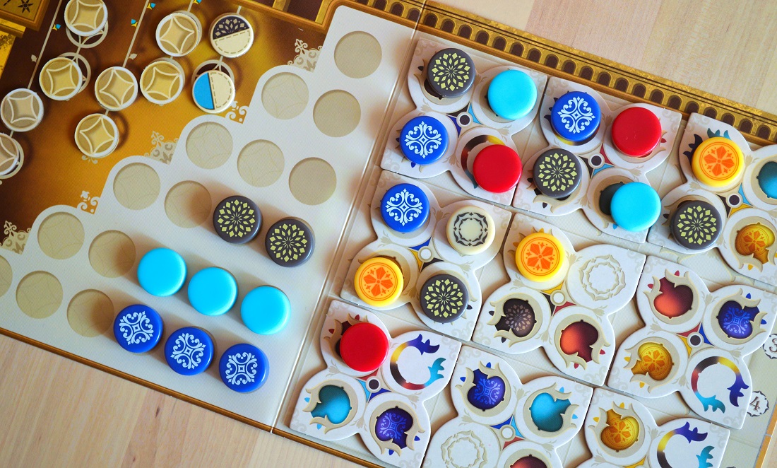 Игра действительно стала немного сложней и дольше, но мне приглянулось следующее: 1) драфт из первого Азула, который всё так же хорош; 2) случайный набор целей, что порой ощутимо влияет на подход к заполнению; 3) бонусные жетончики, которые помогают подстраховаться; 4) драфт из лунных зон, к которому добавили дополнительный тактический слой с формированием столбцов.