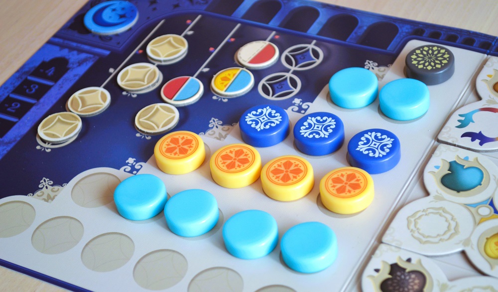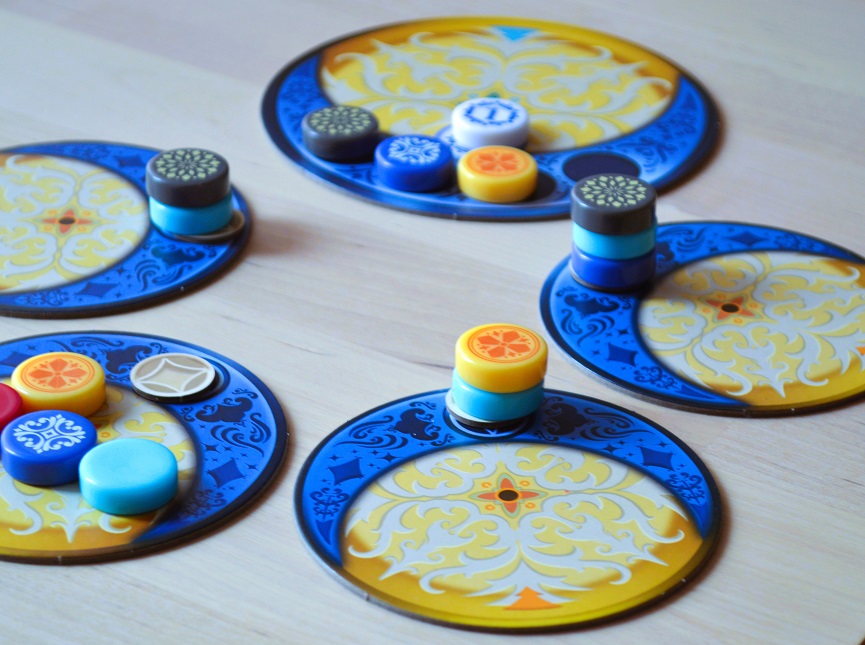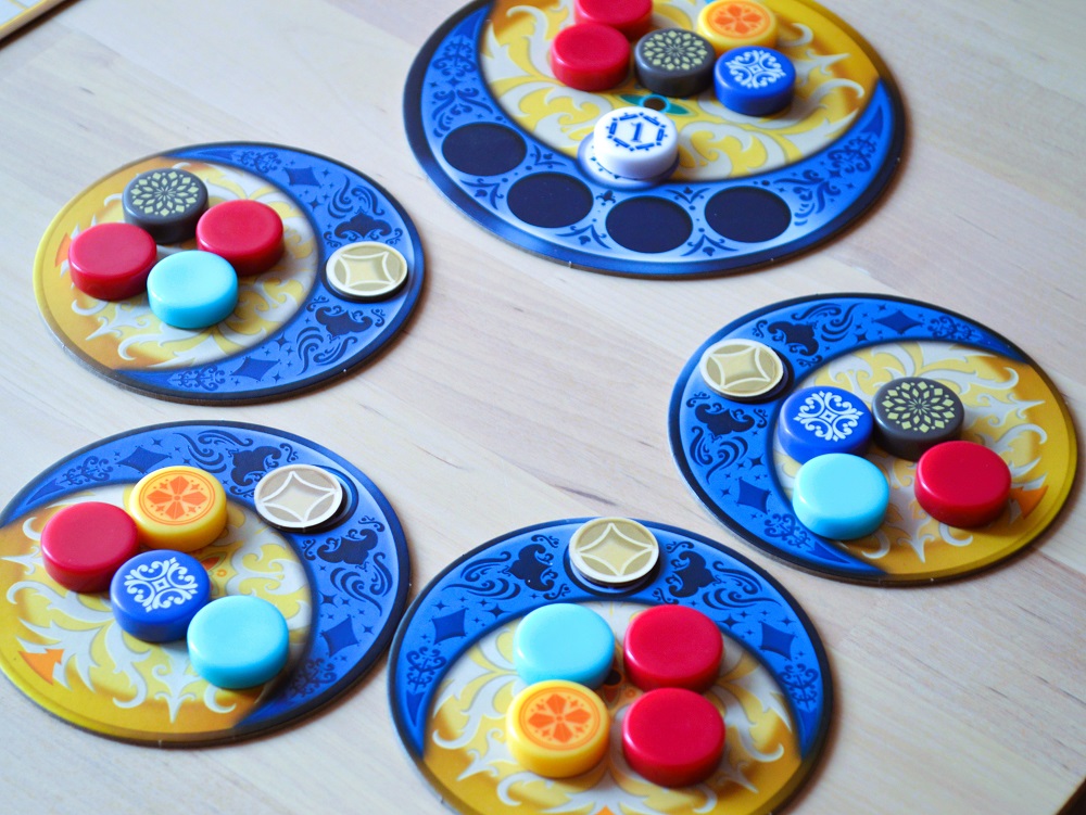 На мелкие же тарелки в начале каждого раунда в лунную зону кладётся по случайному бонусному жетону лицом вниз. И, как только столбец иссякнет, жетон переворачивается, и его можно взять в качестве третьего действия. На жетоне обозначены цветные половинки, их можно конвертировать в реальные плитки для завершения рядов: два жетона с одним цветом в плитку того же цвета или три любые жетона в плитку любого цвета.