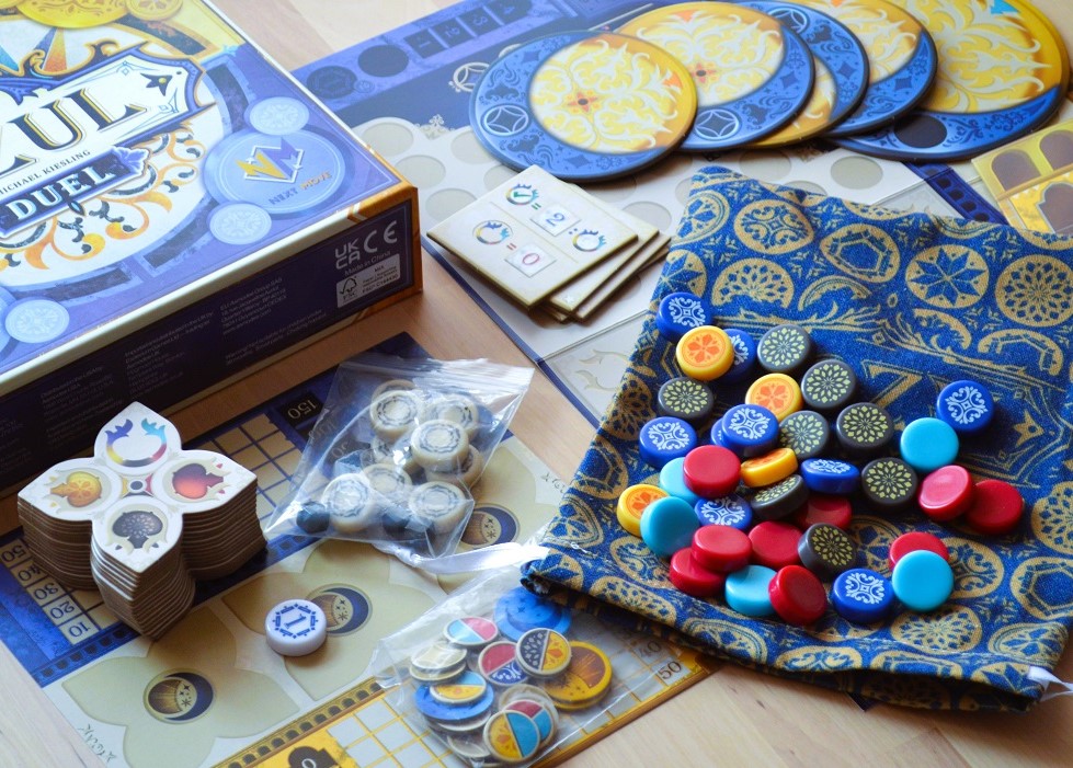 Когда дуэлька пришла, то сразу стало понятно, почему так дёшево. Коробка намного меньше по размеру (примерно, как Пэчворк) и не такая качественная и плотная, планшеты игроков тонкие и складные, органайзером не пахнет. Плюс, плиток, которые теперь круглые, тоже меньше (75 против 100). С другой стороны, печать тут с двух сторон.