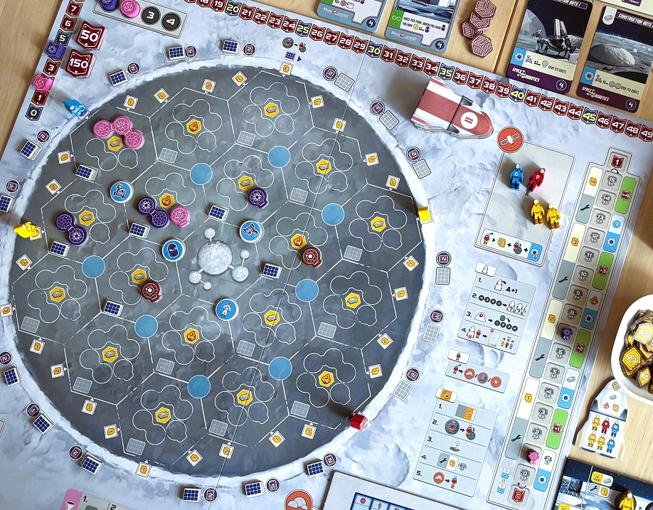 Если же углубляться, то в игре имеются две довольно оригинальные фишки. Первая – это как выполняются действия на Луне. Рабочий ставится на одно из свободных мест вокруг Луны и тут же активирует весь ряд, вернее, гексы-секторы, где есть постройки, причём, неважно, свои или чужие.