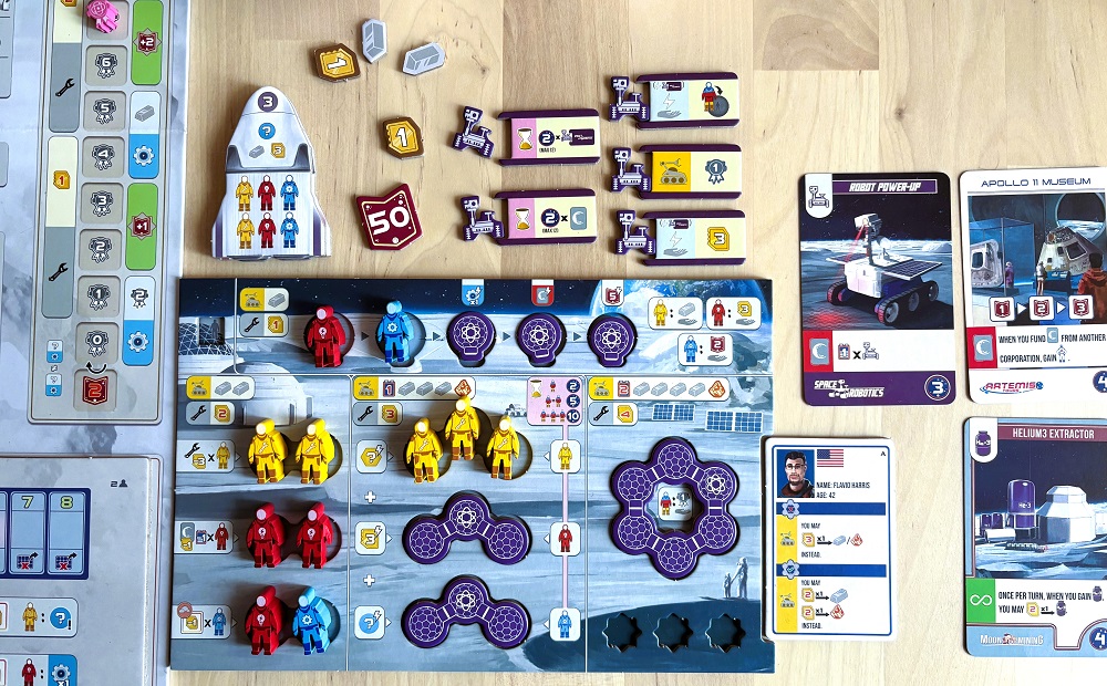 Партия длится 3 раунда, где вначале происходит драфт стартовых астронавтов и ресурсов, а также определяется порядок хода. Затем идёт основанная фаза, в которой игроки по очереди посылают своих подопечных поработать непосредственно на поверхность Луны, построить здания или реализовать проекты – купить полезные карточки корпораций. Завершает раунд фаза менеджмента, в ней игроки получают астронавтов с Луны, которые распределяются уже по личному планшету, принося различные плюшки. Также в этот момент необходимо заплатить денежку за содержание размещённых на поле построек.