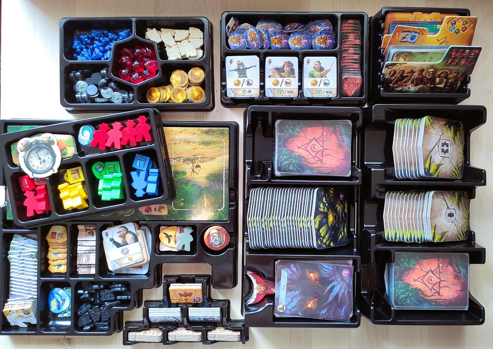 Например, для ресурсов и тайлов, которые часто используются во время партии (помощники, локации) идут лотки, которые сразу же можно выставить на стол. У меня только одна претензия к органайзеру, где лежат локации – почему в третьем отсеке находятся карты, а не тайлы монстров? Но переложить не проблема. В общем, за дизайн оргов зачёт.