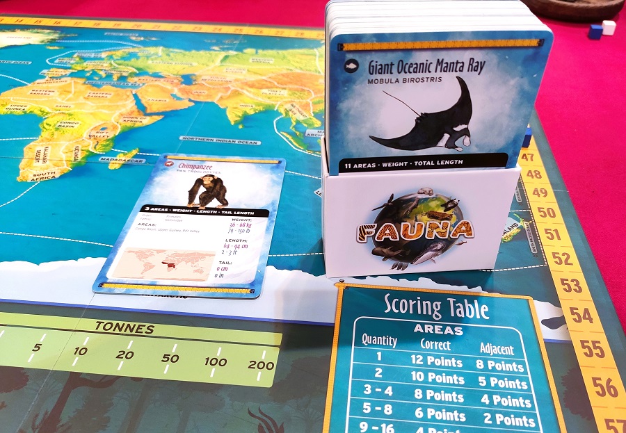 Ничего плохого о Fauna сказать не могу, ведь это достаточно годная викторина на тему животного мира. Показывается карточка, а потом все размещают кубики по карте и трекам, пытаясь угадать регионы обитания, размер, вес и т.п. Затем сверяются правильные ответы и начисляются очки (за точное попадание и за “выстрел” рядом), причём, если удалось угадать редкий регион, то очков достанется больше. В коробке 360 зверушек, которые делятся на лёгкие и посложнее. 7/10.