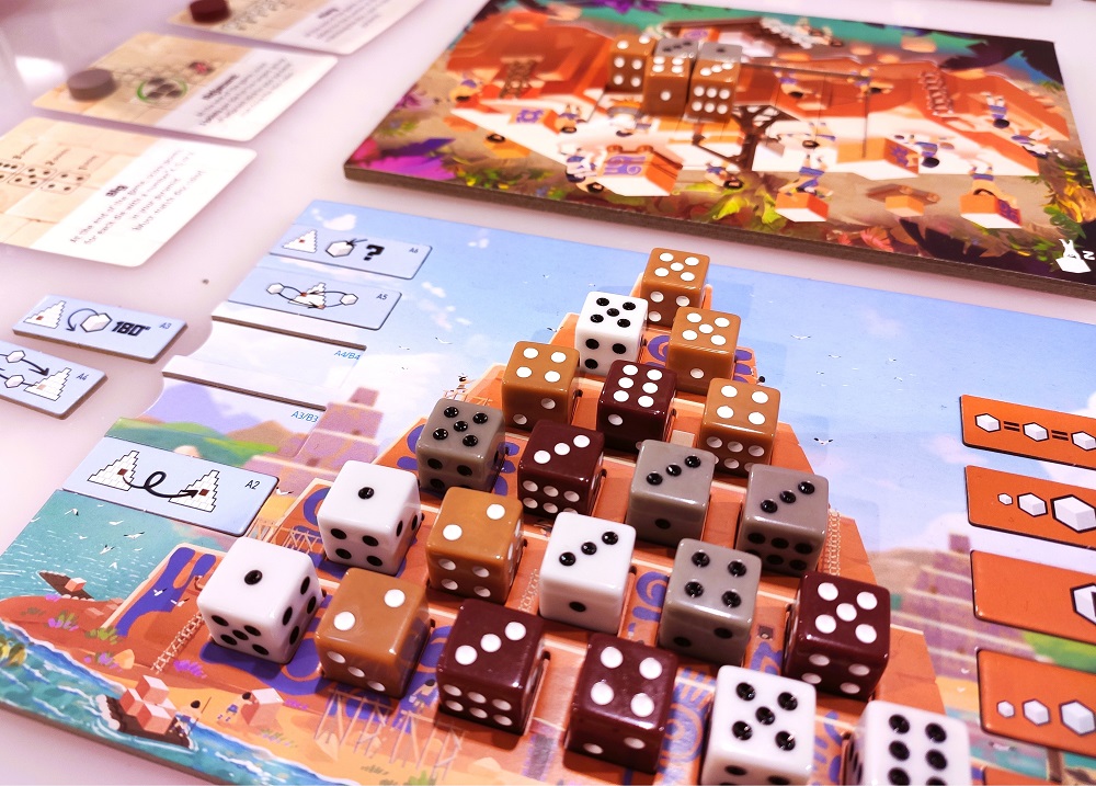 Pyradice. Абстрактная головоломка на формирование эффективной пирамиды из кубов на своём планшете. Драфт кубиков осуществляется из общей трёхмерной пирамиды. В свой ход можно брать только те кубы, у которых 3 открытых грани. Складывается пирамида по стандартным законам – на верхний этаж кубик можно поставить лишь тогда, когда под ним имеется основание из двух ранее размещённых кубов.