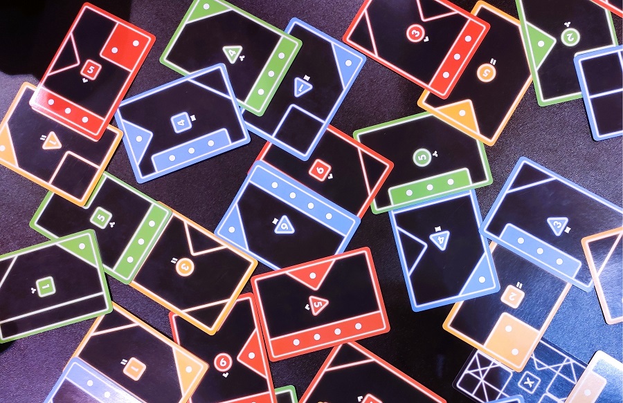 Tacta. У всех одинаковый набор карточек с точками-очками и различными сочетаниями рамок и уголков. Задача – закладывать точки соперников и иметь больше видимых своих точек на конец партии. Шлёпать карты абы как нельзя, ведь накрывать можно только одну карточку, да так, чтобы рамка вокруг карт не прерывалась. Есть тут и фишечка – играть из своей стопки можно либо верхнюю, либо нижнюю карту.