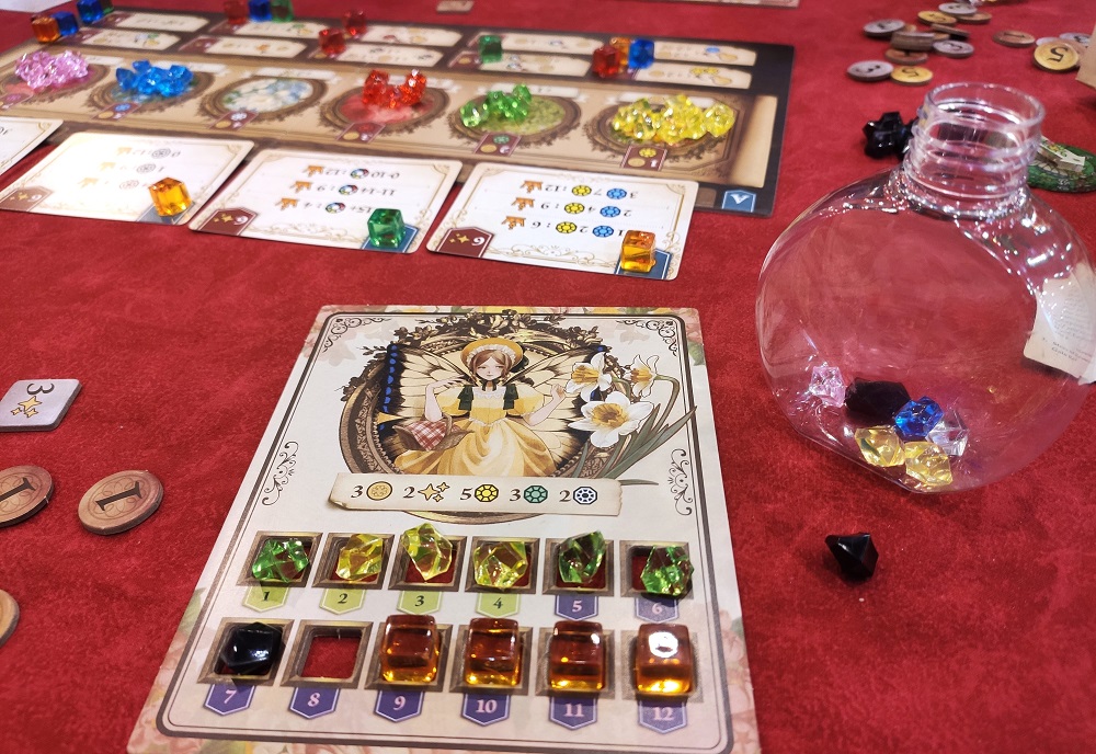 За умело высыпанные ингредиенты покупаем новые более мощные камешки, активируем способности и бронируем цели. Маркеры способностей и целей открывают ячейки для новых камешков, повышая лимит вытряхивания. Оформлено всё красочно, есть даже некий азарт и подобие движков по заработку победных очков. А в более сложном варианте персонажи-феи имеют уникальные абилки. После пробы друг купил для игры с детьми. 7/10. Хотя в базовой версии у Шарлатанов реиграбельность повыше будет.