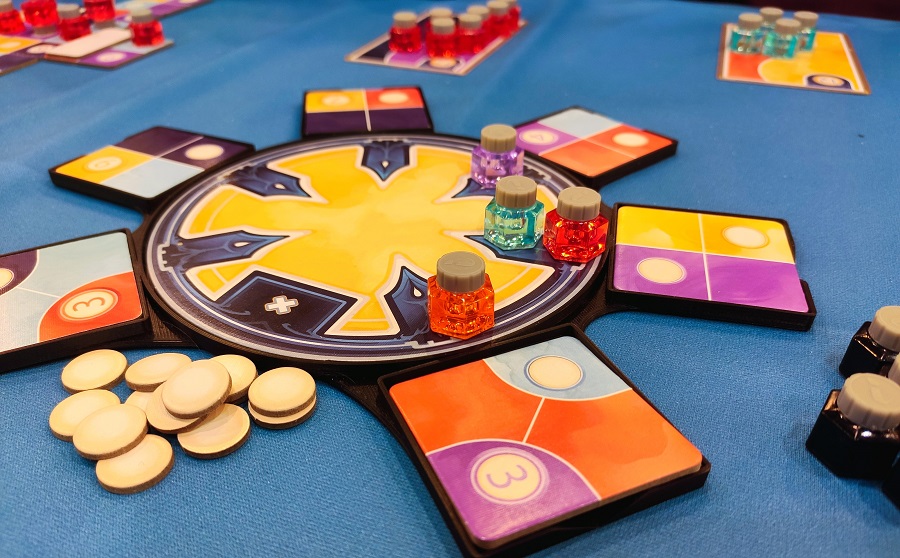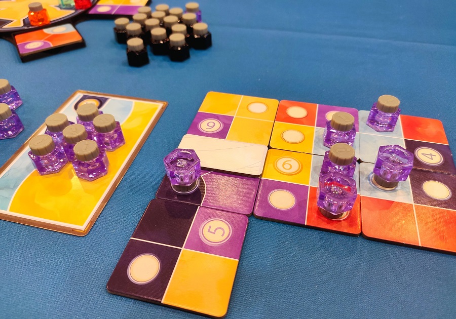 Драфт тайлов осуществляется на ронделе, где при пересечении круга из мешка тянется штрафная плашка, накрывающая полезные ячейки. Циферки на тайлах обозначают, сколько условных клеток должно быть в зоне данного цвета, чтобы можно было выставить на неё свои мини-чернильницы. Правда, чернильницы ставятся только на белые кружки. Логично, что большие зоны собирать сложнее, но за их “закрытие” полагается бонус, можно, например, куда-нибудь выложить белый кружок или вовсе убрать чернильницу из игры. Стоит сказать, что каждому игроку достаётся два персональных цвета, на которые следует налегать, ибо часть фишек можно выставить лишь на эти конкретные цвета.