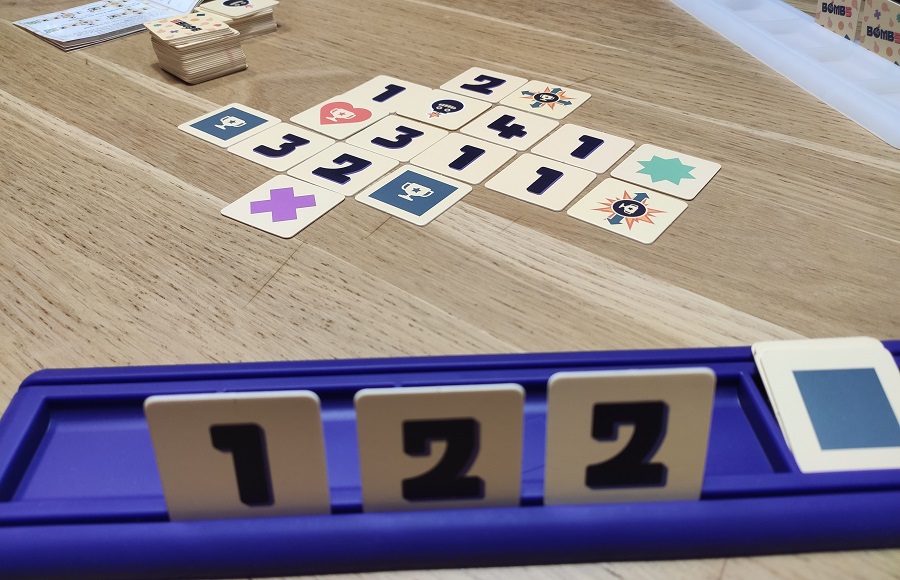 Bomb5. И снова что-то невнятное. Нужно выложить все свои кубки лицом вверх. В свой ход размещаешь тайлики, чтобы в ряду или колонке в сумме получить 5. После этого с одной стороны ставишь свой кубок, а с другой – либо переворачиваешь кубок соперника, либо добавляешь и активируешь тайл бомбы. Бомба показывает, в каких направлениях следует перевернуть кубки/бомбы, что может как навредить, так и помочь соперникам.