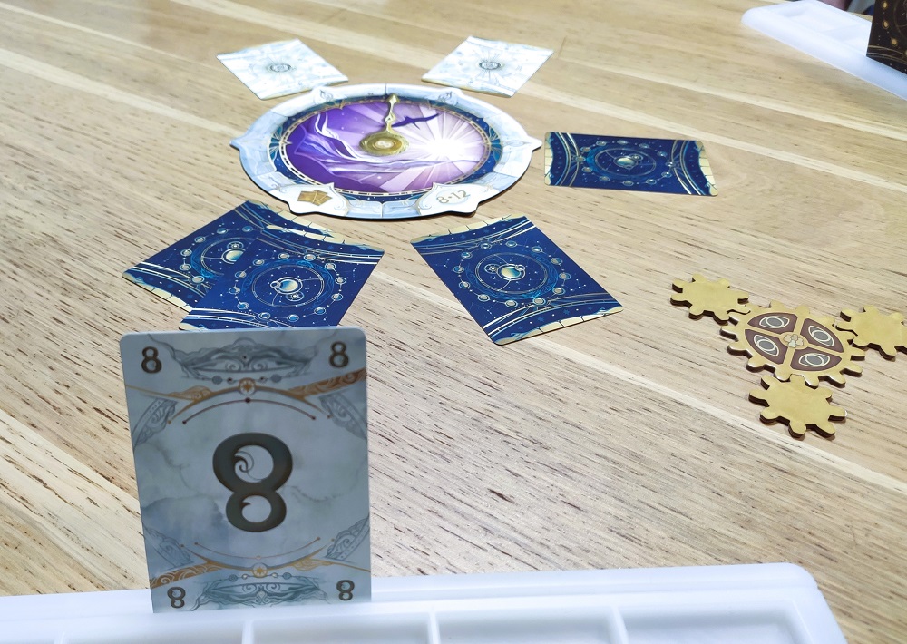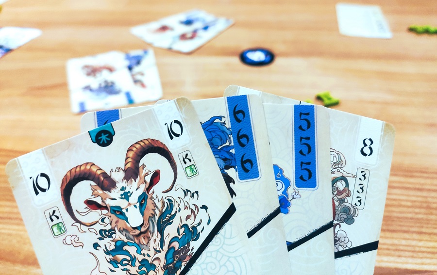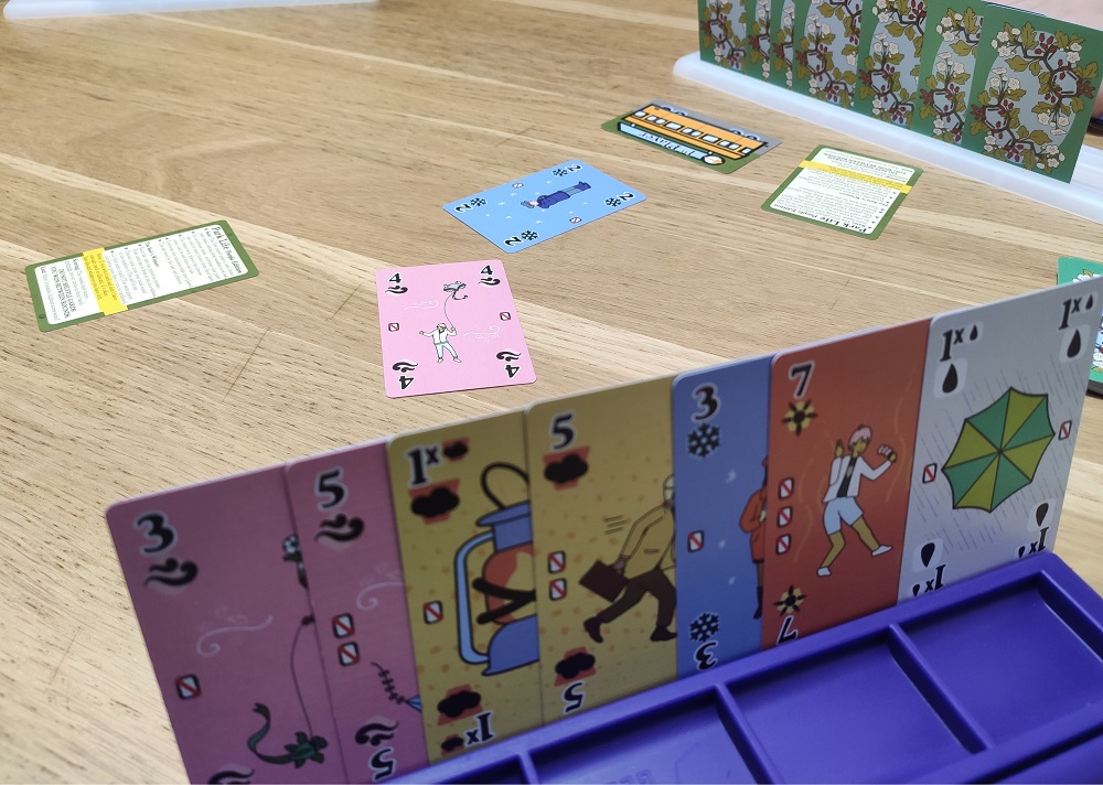 Короче говоря, тут есть нечто от Skull King, когда нужно делать ставку, сколько взяток возьмёшь. Только здесь, если число взяток уже превышает заявленную ставку, то её можно скорректировать. Ставки делаются карточками с цифрами 1,2,3,5,7, и твоя ставка является суммой выбранных цифр. Если угадал – заявленные карточки сбрасываются. Цель – первым избавиться от всех карт ставок.
