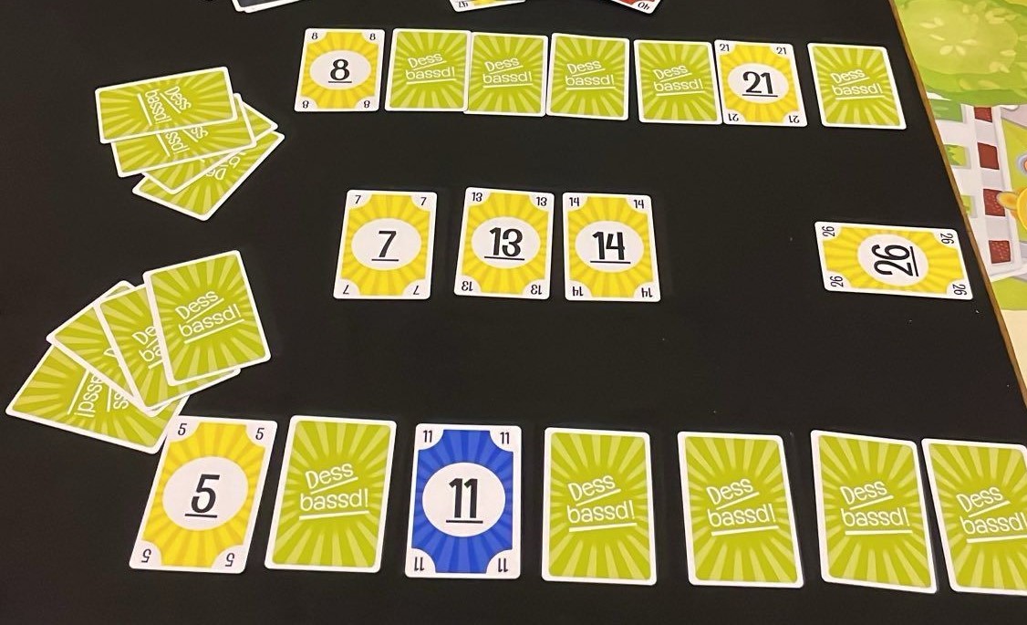 Dess Bassd. Ещё одна вариация на тему “расположи карты по возрастанию”, куда приплели трики. Перед каждый игроком выкладывается ряд из 7 закрытых карт, по 4 раздаётся на руки, а в центре стола располагается рынок. Играется стандартная взятка, после чего, начиная с победителя, все выбирают одну карточку с рынка и заменяют ей одну в личном закрытом ряду. В свою очередь, карта из ряда идёт на руку, а сыгранные во взятку карточки становятся новым рынком! Побеждает тот, кто первым сложит ряд по возрастанию.