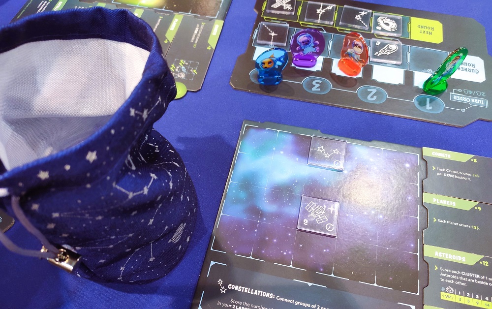 Twinkle Twinkle. Прям много годных семеек было в этом году, вот вам ещё одна. Из прозрачных тайликов созвездий и прочих небесных тел складываем ночное небо 5 на 4 клетки, стараясь максимизировать очки. Прозрачность добавляет выбора при размещении, так тайл можно перевернуть.