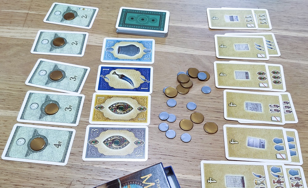 Очки дают монеты (3:1), карты коллекций и сами товары, но только, если в каждом цвете их больше, чем 1, иначе их придётся сбросить. В принципе, неглупый филлер. Если следить за соперниками, то можно что-то планировать, ведь деньги тут уходят очень быстро. Ну, и можно пакостить соперникам, быстро разбирая монеты и не давая им желанные товары. 6.5/10.