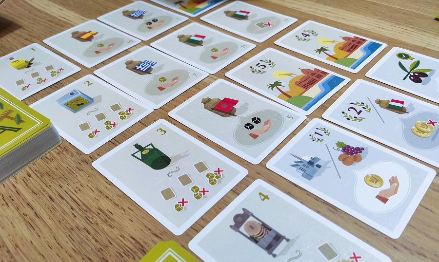 А так игра представляет совой логичный цикл, когда ты собираешь оливки, конвертируешь их в масло, а потом это масло меняешь на победные очки. Только тут кроме просто очков можно ещё инвестировать в так называемые национальные рынки или попросту флаги, ценность которых к концу партии может вырасти. Дело в том, что подобные карты не только покупаются, с них можно использовать одноразовый бонус, после чего отправлять в зону скоринга, тем самым повышая ценность того или иного флага в своей колоде.
