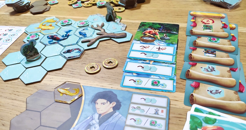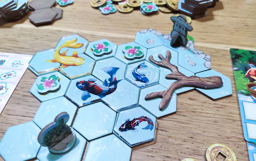 Получается, что в начале партии желательно набрать немного помощников, чтобы потом можно было более эффективно выкладывать скопившееся в хранилище добро. Больше всего очков тут зарабатывается на карпах, которых следует окружать водой и лилиями. Вариативности добавляют карты целей – всего их 10, а на партию выбирается 3 случайных. Цели вроде бы не особо сложные, но зато визуально очень привлекательные. Пруд можно украсить мостом, статуей и прочими картонными фигурками.