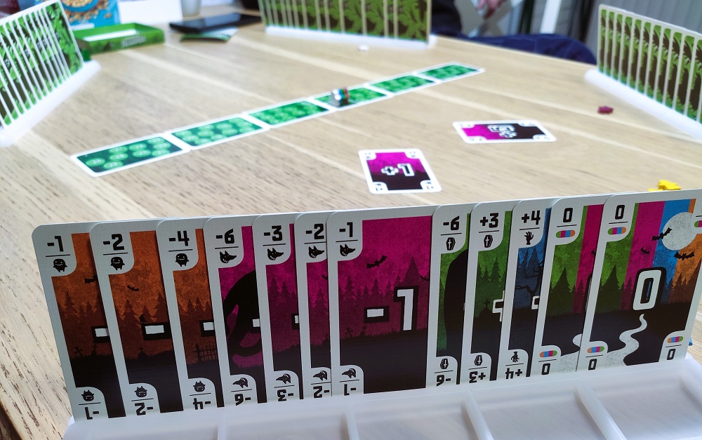 Получается, что нужно распланировать руку так, чтобы к концу раунд оказаться как можно ближе к нулю. И это можно делать, двигаясь маленькими шажками или, наоборот, взяв большой плюс, а потом минус. Играть на ноль тут не получится, так как тот, кто не сдвинулся со старта (с хижины), получит 15 очков.