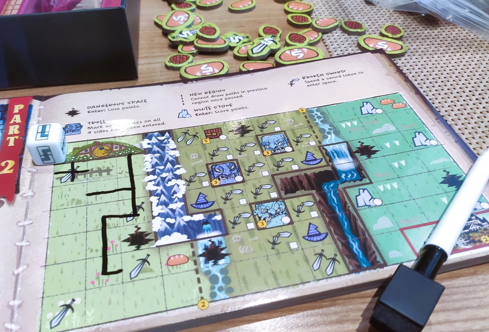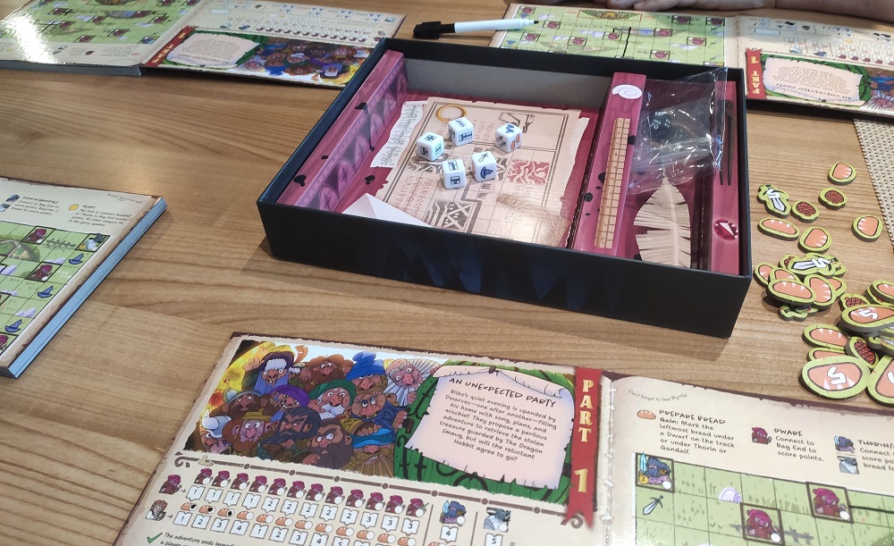 The Hobbit: There and Back Again. Всё, триков больше не будет. А будет roll & write от Книции по Властелину Колец. Для каждого заготовлена книжка, в которой 8 сценариев. Брошенные кубы игроки выбирают по кругу, начиная с активного, которому достаётся ещё и последний. На кубиках дорожки, хлебушек, мечи и шляпы. Хлебушек и мечи работают согласно сценарию, но чаще всего либо отмечаются на треках, либо копятся в виде жетонов. С помощью дорог рисуем маршруты, а шляпы чаще всего дают бонусы, помогая нивелировать рандом.
